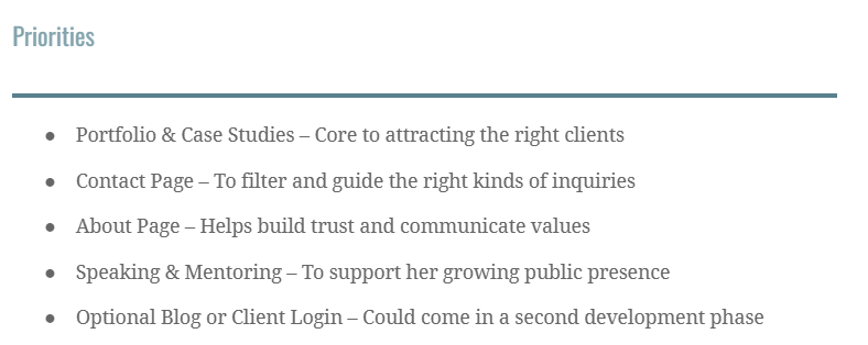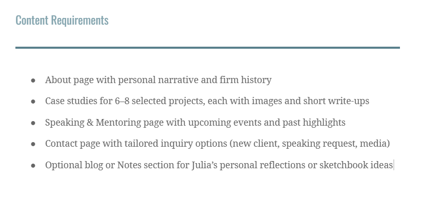I created a detailed storytelling persona, Julia Sterns, a professional designer and studio owner, then developed a full content requirements summary outlining what the new site would include, prioritize, and avoid.