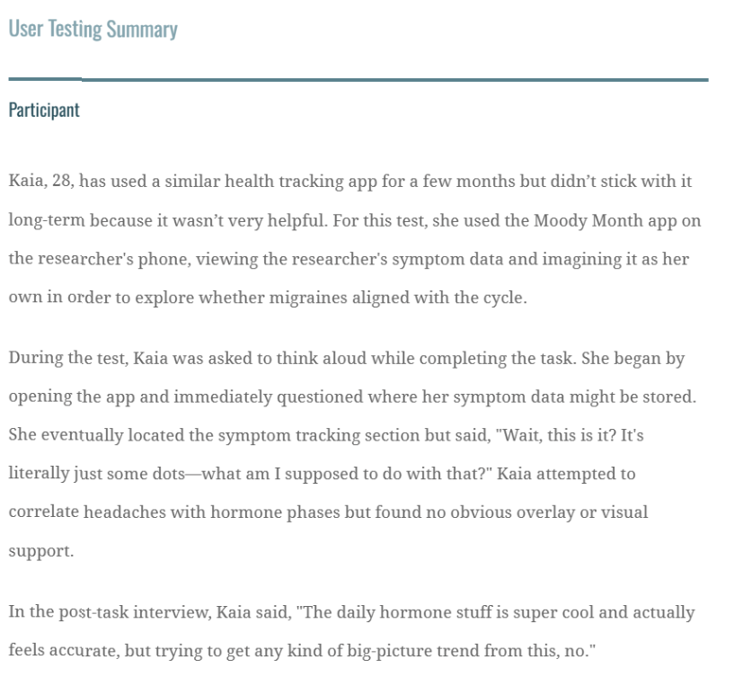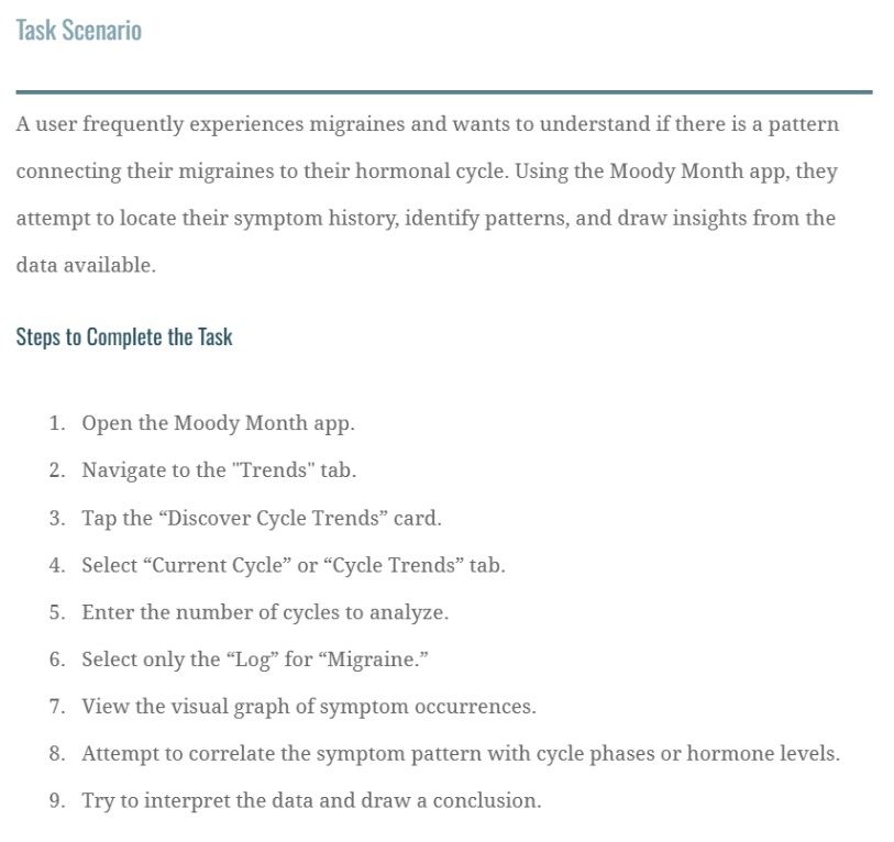 - Developed a task scenario where a participant attempted to analyze migraine patterns in relation to hormonal phases using the app’s “Trends” feature.