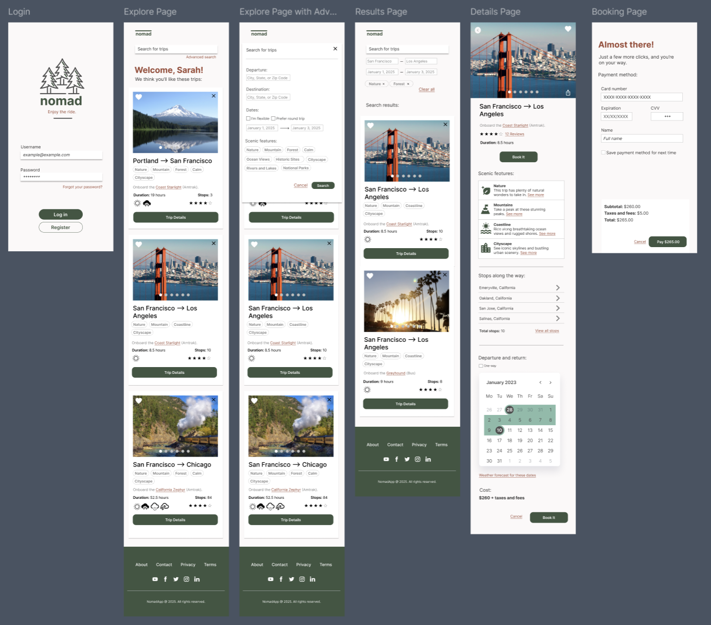 The Nomad Travel App was designed to help users discover and book scenic train journeys. The project began with user research and empathy mapping to understand travel motivations and frustrations, followed by low-fidelity wireframes and a polished high-fidelity design. The result was a cohesive, user-centered concept focused on exploration, ease of use, and emotional connection to travel.