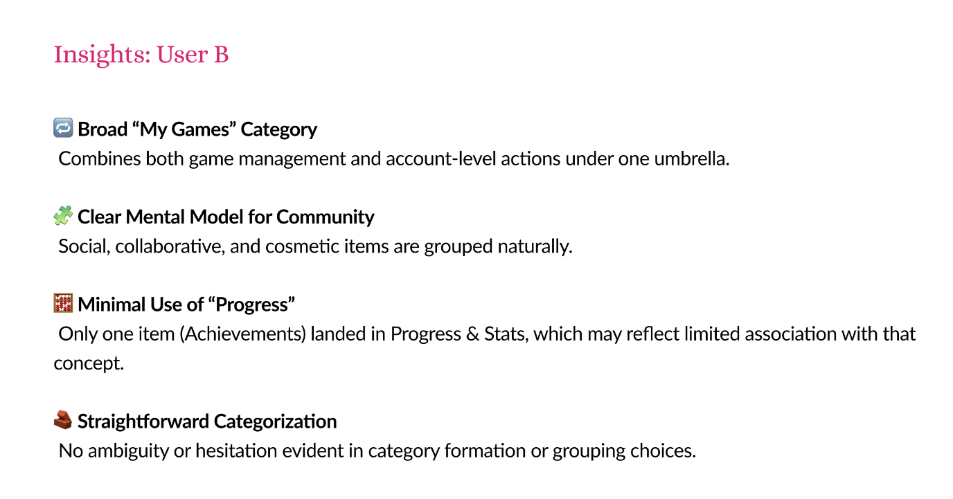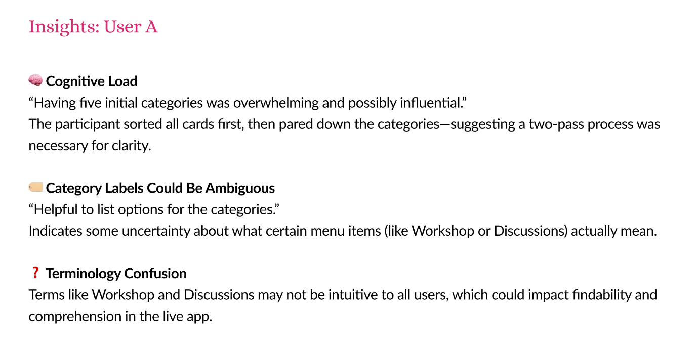 - Designed and ran an open card sort to test how users grouped and labeled key menu items.