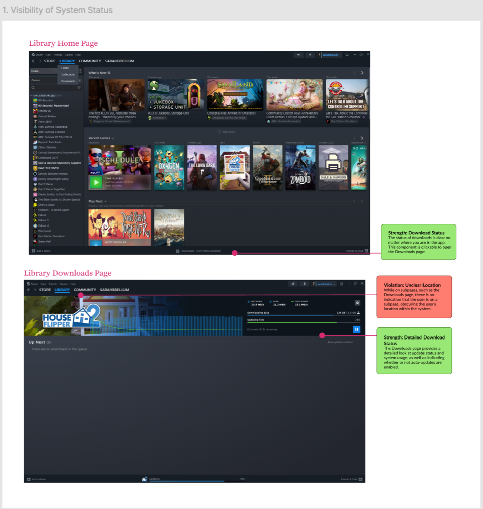 This project evaluated the Steam desktop app’s navigation and interface using Nielsen’s heuristics and user testing feedback. The goal was to identify where users encounter confusion and to provide design recommendations that improve clarity, consistency, and flow.