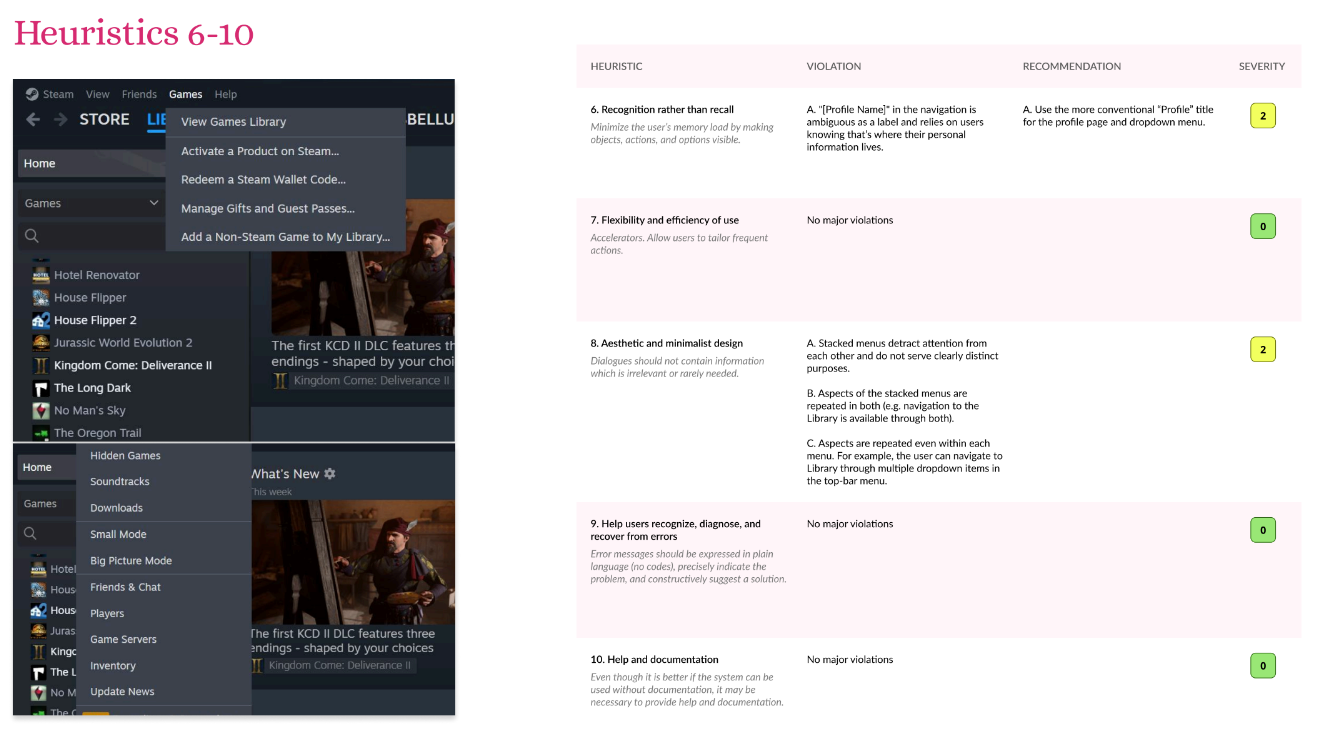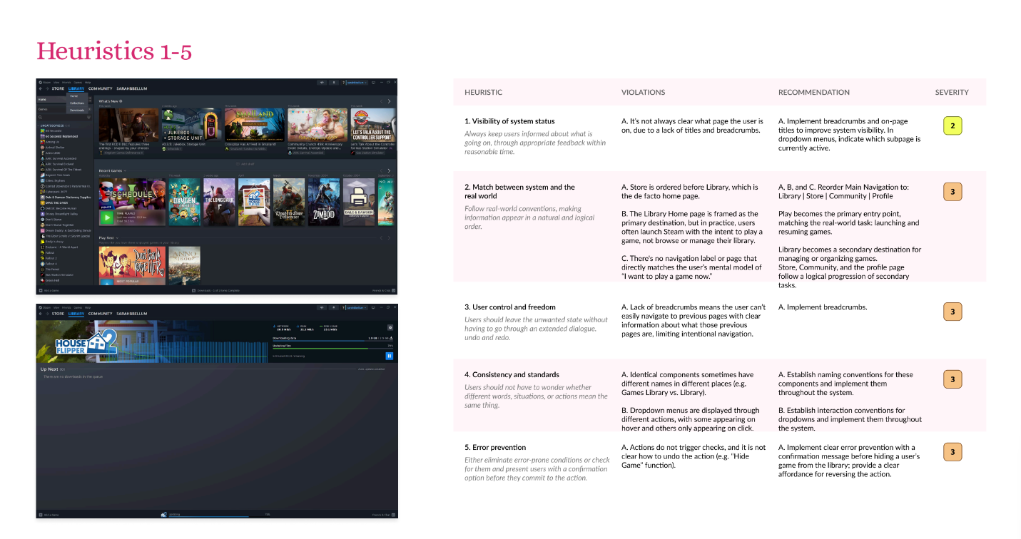 This project evaluated the Steam desktop app’s navigation and interface using Nielsen’s heuristics and user testing feedback. The goal was to identify where users encounter confusion and to provide design recommendations that improve clarity, consistency, and flow.